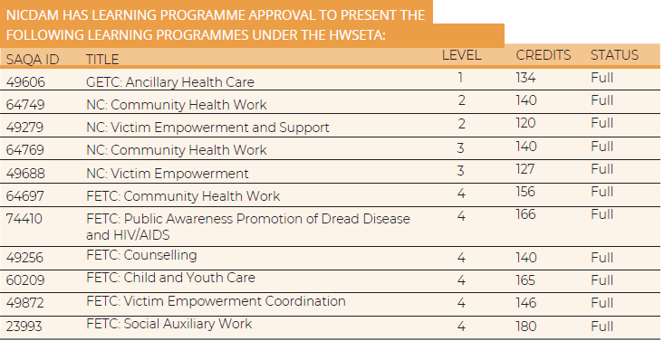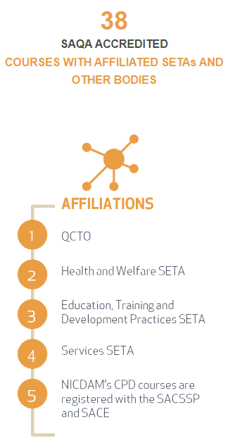 NICDAM is registered as a fully accredited training provider with the Quality Council for Trade and Occupations (QCTO), Health and Welfare Sector Education and Training Authority (HWSETA), Education Training and Development Practices (EDTP) SETA and Services SETA.