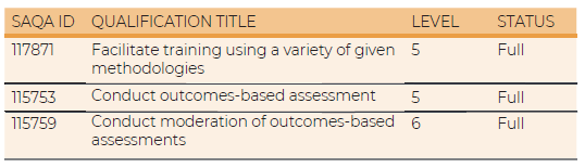 Courses are facilitated by registered assessors and moderators with extensive practical experience in the field.